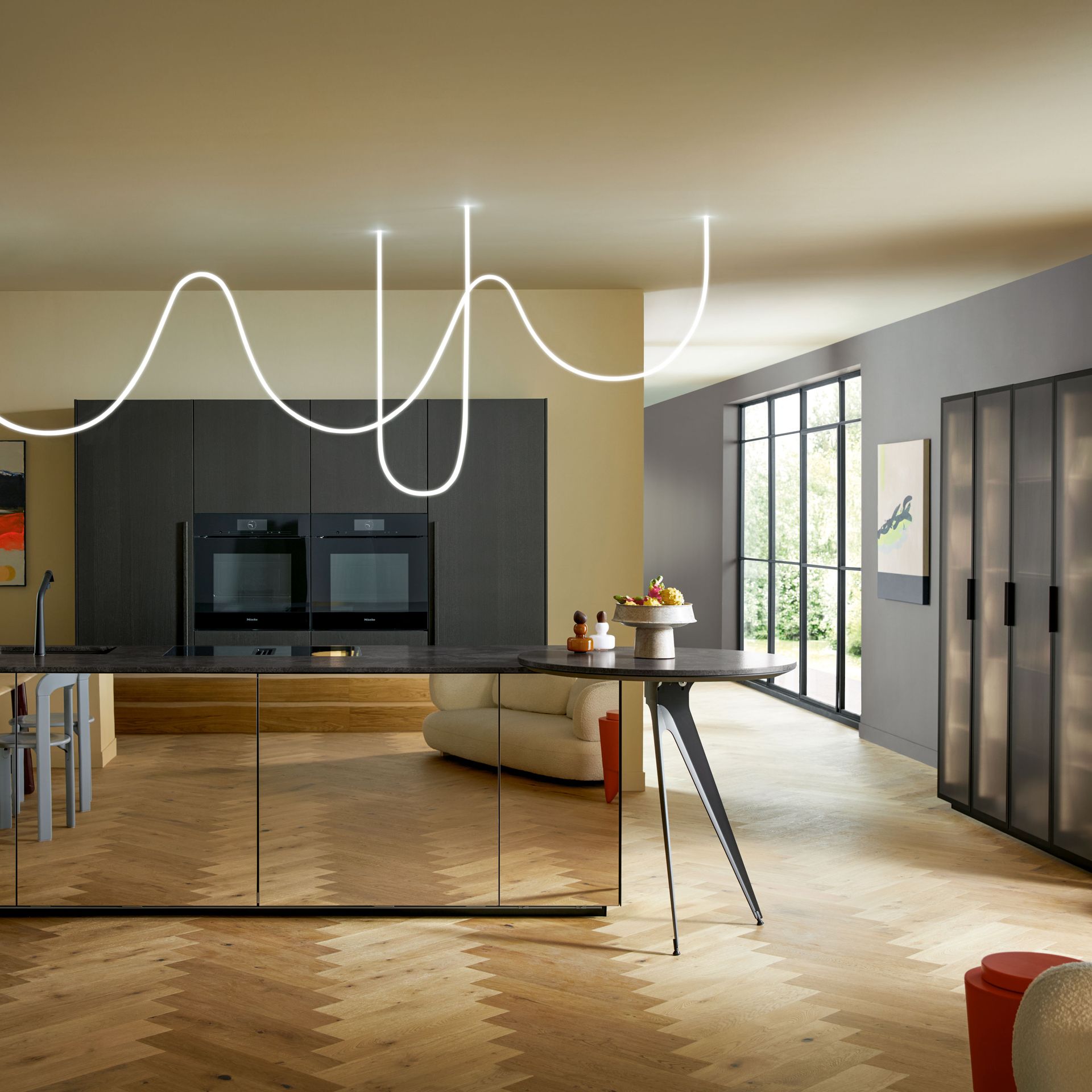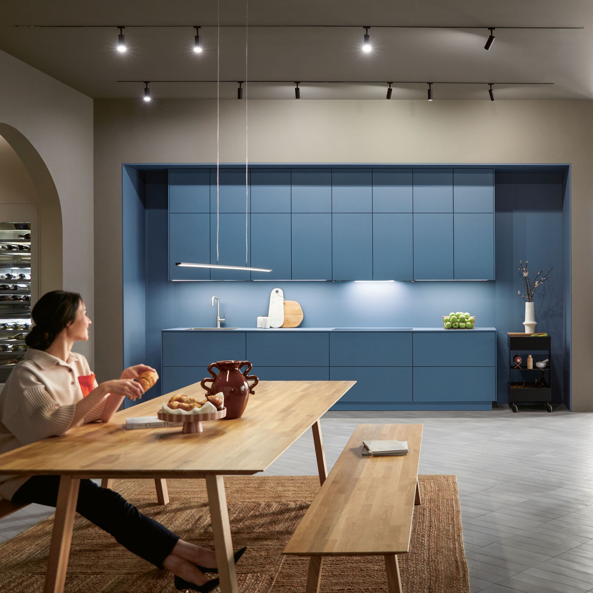 Wie sieht die Küche in den 2020-er Jahren aus? Eines ist klar: Sie ist offen für Neues. Offenes Wohnen ist so aktuell wie nie zuvor, und die einzelnen Lebensbereiche verschwimmen. In der Küche wird gearbeitet, gustiert und gekostet, auch gegessen, gechillt und verweilt. Das nicht mehr so wie vor einigen Jahren meist in klinischem Weiß, sondern in eher dunkleren Tönen. Dabei reicht der Bogen von Anthrazit über Mitternachtsblau und Tannengrün bis zu dunklen Hölzern, in die sich immer wieder ein neuer, leichter Rosé Ton mischt und für frischen Wind sorgt. Diese Farbwelt ist oft matt, in Anti-Fingerprint Optik, meist grifflos und mit vielen praktischen Details gespickt. Es gibt unzählige Varianten, um typische Küchenhelfer verschwinden zu lassen, die dann mit einem Handgriff sofort parat sind. Die Zeiten, in denen die Küche offensichtlich mit ihren technischen Hilfsmitteln geprahlt hat, sind Schnee von gestern. Alle Linien sind klar und puristisch. Die Küche beeindruckt als stylishes Designmöbel und Blickfang zugleich.